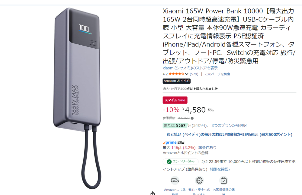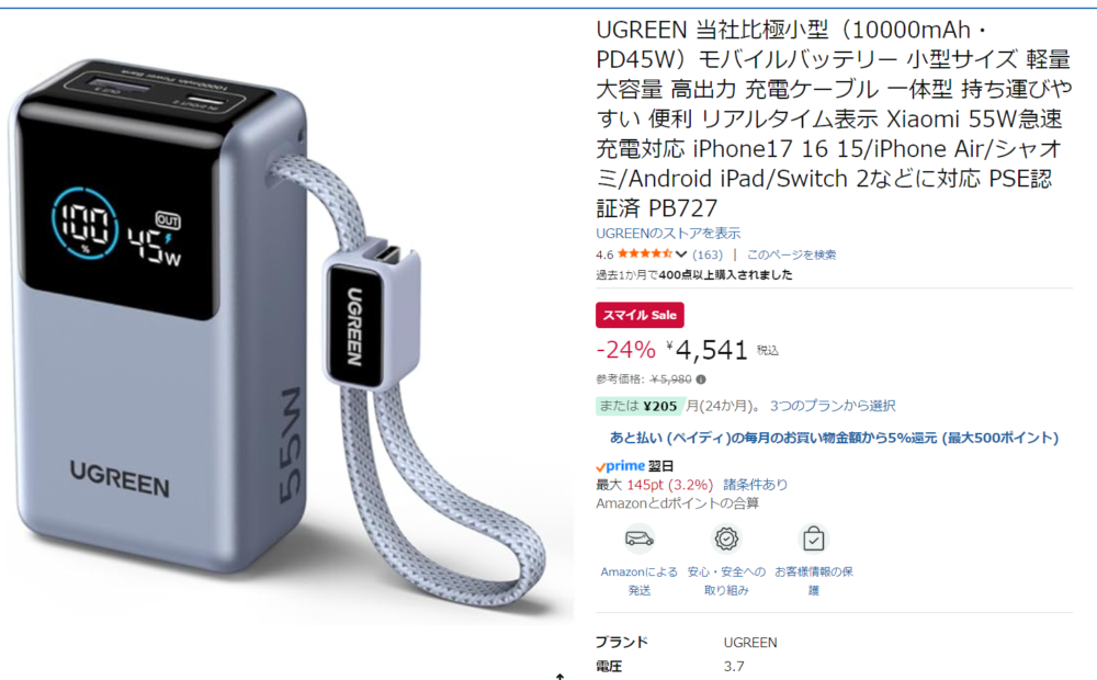 先ほどのモバイルバッテリーとは違い、コチラは万人におすすめできる製品で、ケーブル一体型かつ45Wの高出力、という使い勝手がかなり良いです。また、Xiaomi HyperChargeに対応というモバイルバッテリーの中ではかなり珍しい仕様で、Xiaomi端末を55Wで充電できるのもポイント。