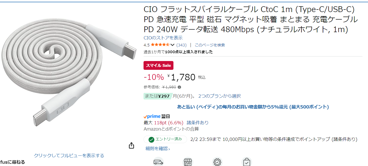 去年のブラックフライデーセールの際に購入して数カ月間使用してきましたが、コイツはマジでいいです。持ち運び用のケーブルなら過去一推したいと感じました。